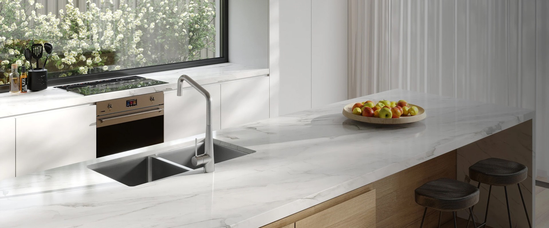 Offering a low profile edge, the Brighton sink has a streamlined, brushed finish that integrates with modern appliances.